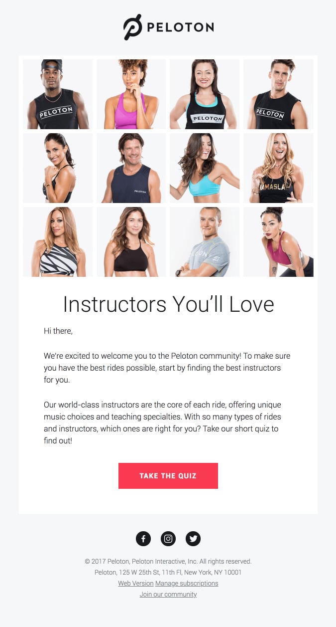 Załóżmy, że Twój nowy subskrybent już zarejestrował się w Twojej usłudze lub kupił Twój produkt. Co teraz? Im bardziej zaangażowani subskrybenci pozostaną przy Twojej marce, tym większe prawdopodobieństwo, że utrzymają związek. I tu właśnie pojawia się treść. Stale rozwijaj interesujące treści, takie jak ten quiz z Peloton. Dodaje element ludzki do marki, którą ich subskrybenci już pokochali, pomagając scementować poczucie długoterminowej lojalności.