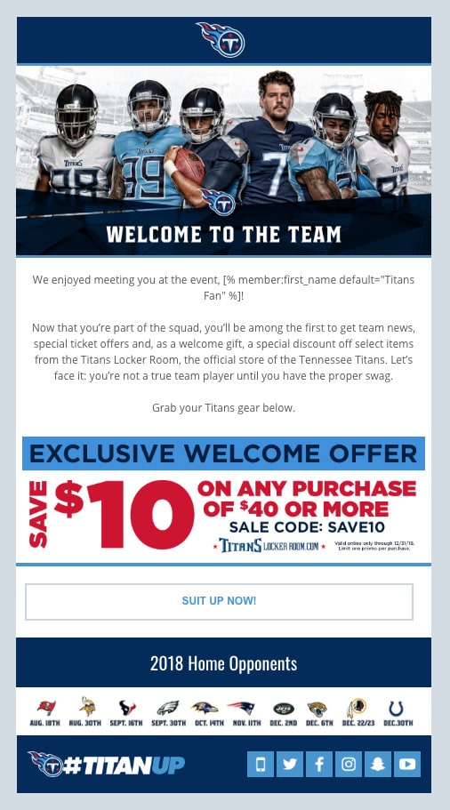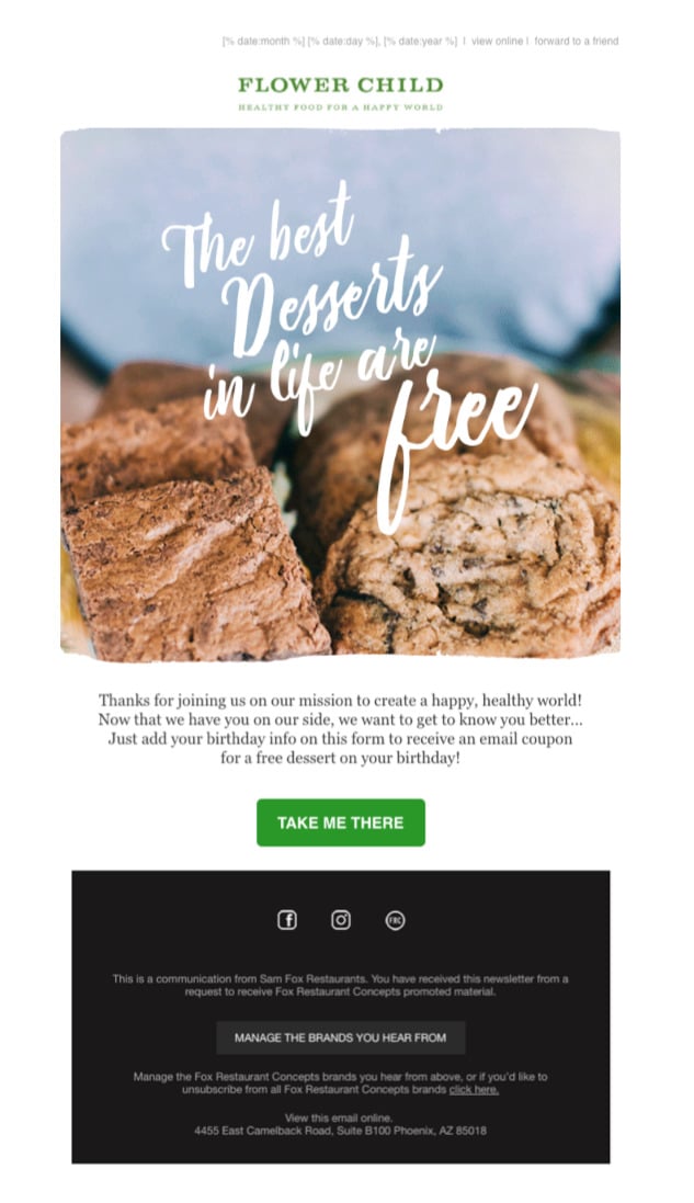 To klasyczna zagadka w świecie poczty e-mail: potrzebujesz jak najwięcej danych subskrybenta, aby móc wysyłać ukierunkowane wiadomości, ale nie chcesz też umieszczać zbyt wielu pól w formularzu rejestracji. Łatwa naprawa? W e-mailu powitalnym poproś o wszelkie potrzebne dane. Kiedy ustawisz zapytanie jako ofertę, Twoi nowi subskrybenci będą bardzo chętni do tego. A oferta nie musi być ciasteczkiem z kawałkami czekolady, aby była atrakcyjna: na przykład w przypadku marek B2B po prostu powiedz swoim subskrybentom, że informacje pomogą Ci wysyłać tylko treści, które ich interesują.