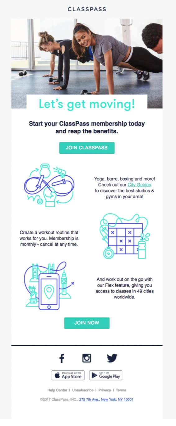 A skoro mowa o korzyściach... to także świetny obszar, na którym można się skoncentrować w wiadomości powitalnej. Wiele marek decyduje się na wysyłanie swoich pierwszych wiadomości e-mail o sobie (ich produktach, usługach, funkcjach), ale ostatecznie Twoi nowi subskrybenci chcą wiedzieć, co dla nich oznacza. Ten przykład z ClassPass inteligentnie przedstawia korzyści dla subskrybenta i zapewnia dwie możliwości kliknięcia i rejestracji: jedną natychmiast na górze, a drugą po dokładnym rozbiciu, co nowi użytkownicy uzyskają z relacji.