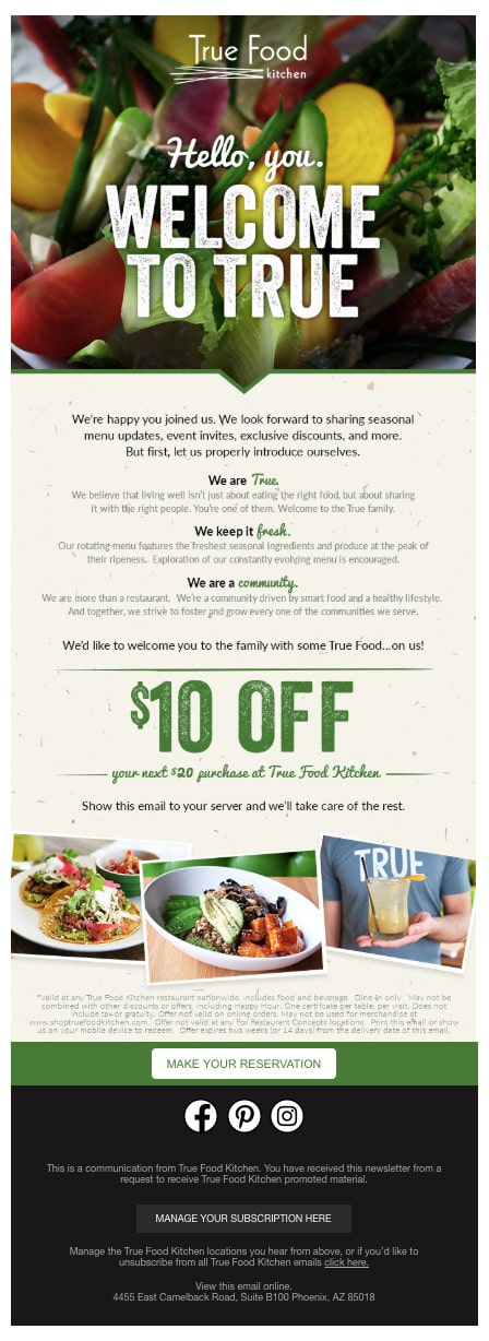 Jeśli Twoja marka ma silną deklarację misji, powitalna wiadomość e-mail jest idealnym miejscem, aby umieścić te wartości na pierwszym planie. Oczywistym przypadkiem użycia byłyby tutaj organizacje non-profit, ale absolutnie podoba mi się, jak True Food Kitchen dostosowała tę koncepcję do własnego e-maila powitalnego. Ich wartości polegają na tym, jak wyróżniają się na tle innych restauracji, więc ma sens, że prowadzą z tą nogą do przodu. A prowadzenie z wartościami nie odbiera wiadomości bardziej skoncentrowanej na konwersji; to wzmacnia.