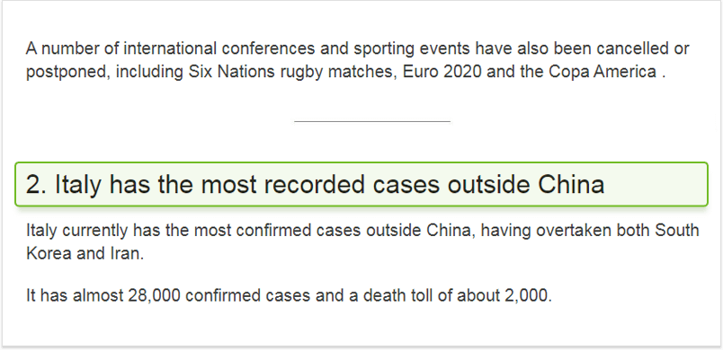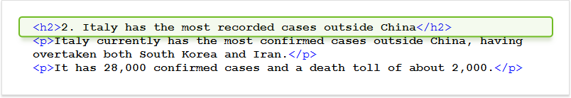 Poniżej znajduje się fragment kodu pobrany z tego samego artykułu BBC o statystykach koronawirusa i widać, że istnieje odpowiednio skonfigurowany nagłówek H2, po którym następują dwa akapity: