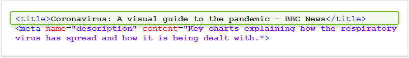 Poniżej znajduje się fragment kodu pobrany z artykułu BBC na temat statystyk koronawirusa. Możesz zobaczyć prawidłowo skonfigurowany tag tytułu znajdujący się bezpośrednio nad metatagiem opisu - o czym będziemy mówić dalej: