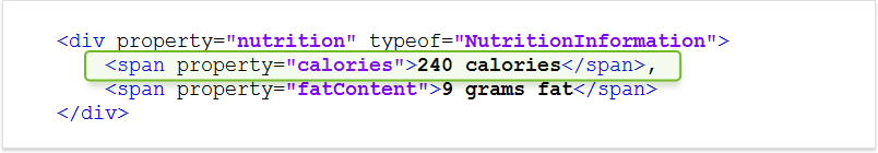 Oto przykładowy fragment kodu określający wartości odżywcze przepisu. Pełną listę elementów dostępnych do znaczników można znaleźć na stronie schema.org: