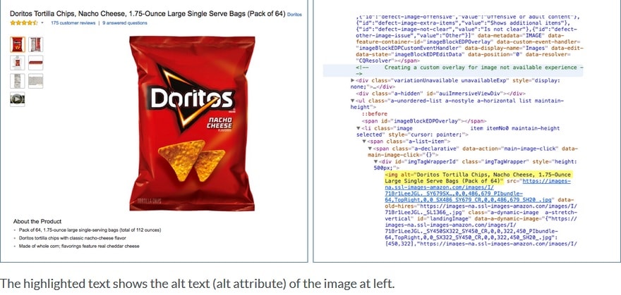 Na poniższym obrazku zwróć uwagę na podświetlony na żółto kod po prawej stronie. To jest znacznik alternatywny dla obrazu torby chipsów Doritos.