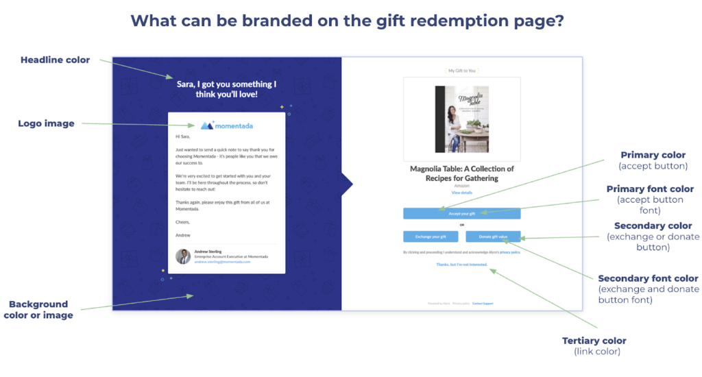 Dzięki nowym funkcjom dostosowywania wprowadzonym w zeszłym roku w Alyce możesz sprawić, że każde doświadczenie będzie możliwe dzięki spersonalizowanemu brandingowi na stronach wymiany prezentów. Tworzenie stron poświęconych odkupianiu prezentów, które pasują do marki Twojej firmy, dostosowywanie inicjatywy prezentów zespołowych lub wyróżnianie specjalnej kampanii lub wydarzenia, nigdy nie było prostsze.