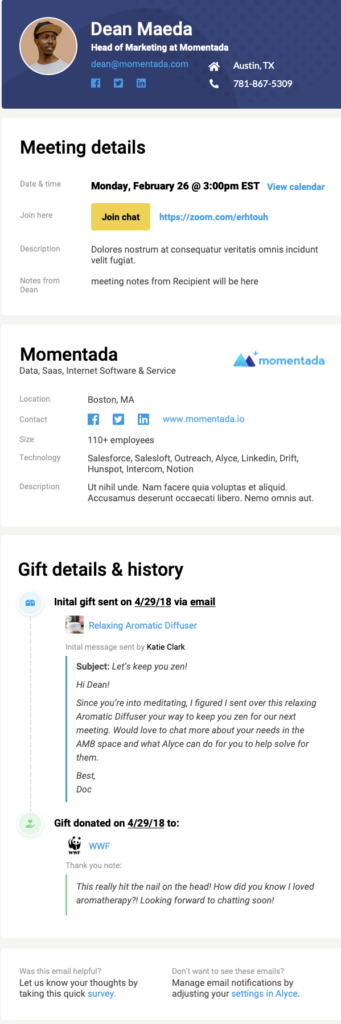 Wprowadź Alyce Assist . Ta nowa funkcja pomaga odciąć się od rozmów towarzyskich, jednocześnie budując osobiste więzi i zachowując porządek. Szczegółowy przegląd zostanie wysłany do Ciebie e-mailem tuż przed rozmową, dzięki czemu możesz mieć pewność, że prowadzisz spotkanie z potencjalnymi klientami