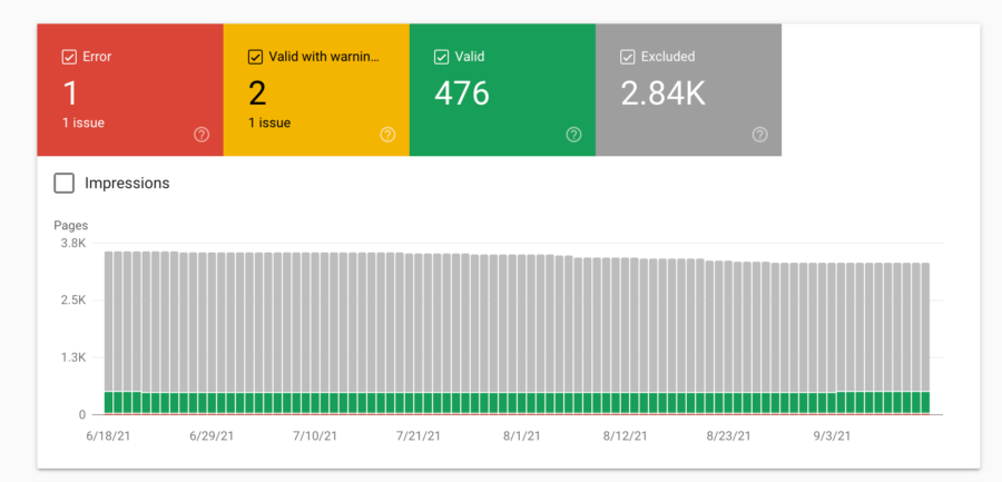 Kolejnym raportem Search Console, na który warto zwrócić uwagę, jest raport „Pokrycie”. To fantastyczna sekcja Search Console, która pokazuje, które adresy URL indeksuje Google i czy uwzględnia je w indeksie.