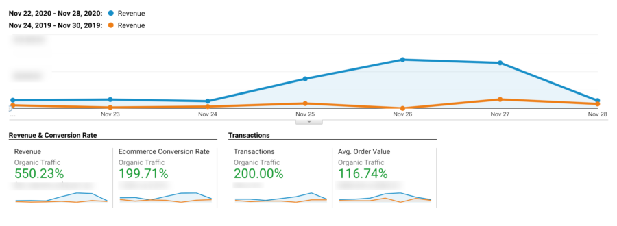 Jednym z naszych ulubionych wskaźników KPI do śledzenia jest ruch organiczny rok do roku. Na przykład, jeśli chcesz zobaczyć, jak Twój sklep radził sobie w tygodniu Czarnego Piątku w porównaniu z poprzednim rokiem, możesz to łatwo zrobić za pomocą Google Analytics. Po prostu utwórz segment dla „Ruchu organicznego”, a następnie użyj osi czasu porównania, aby porównać ruch organiczny z poprzednim rokiem. Na przykładzie możemy zobaczyć, jak ta strona wygenerowała dużo większe przychody organiczne w porównaniu z tygodniem Black Friday w poprzednim roku.