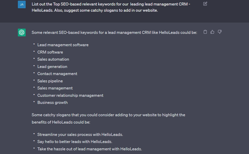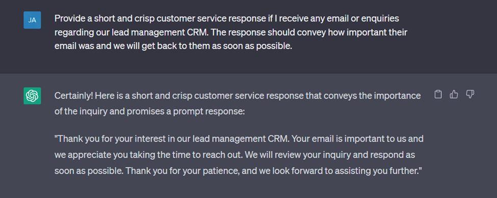ChatGPT może zadawać pytania kwalifikujące, aby odfiltrować potencjalnych klientów, oszczędzając czas i wysiłek zespołu sprzedaży, aby skupić się na zawieraniu umów z potencjalnymi klientami. Dodatkowo ChatGPT może być dostępny 24 godziny na dobę, 7 dni w tygodniu, umożliwiając przechwytywanie potencjalnych klientów nawet wtedy, gdy Twój zespół sprzedaży nie jest dostępny, co skutkuje zwiększoną liczbą generowanych potencjalnych klientów i ostatecznie większą sprzedażą.