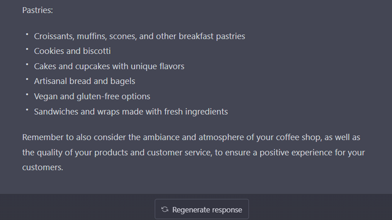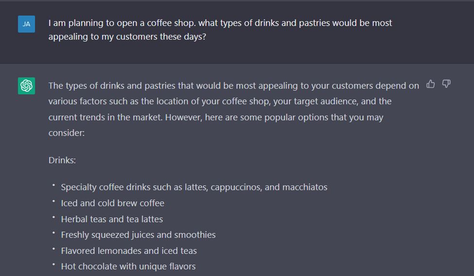 Badanie rynku jest analogiczne do poszukiwania skarbu, z tą różnicą, że zamiast skarbu szukasz cennych informacji na temat docelowych odbiorców. W tym miejscu do gry wkracza ChatGPT dla biznesu, ponieważ można go wykorzystać do przeprowadzania ankiet i różnych innych form badań rynkowych, które mogą zapewnić głębsze zrozumienie preferencji i zachowań klientów. Na przykład, jeśli planujesz otworzyć kawiarnię, możesz przeprowadzić badanie rynku, aby określić, jakie rodzaje napojów i ciastek byłyby najbardziej atrakcyjne dla Twoich klientów.