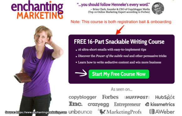 Skoro właśnie udostępnili Ci swoje dane kontaktowe, dlaczego nie pójść dalej? Zwłaszcza, że pomaga to zmniejszyć liczbę rezygnacji i pozwala wyróżnić najlepsze treści. Na przykład Henneke z Enchanting Marketing oferuje 18-e-mailowy kurs, z którego z czasem wylewa się.