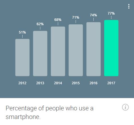 Jak widać na poniższym wykresie, wykorzystanie smartfonów wzrosło w ciągu ostatnich pięciu lat z 51% do 77%.