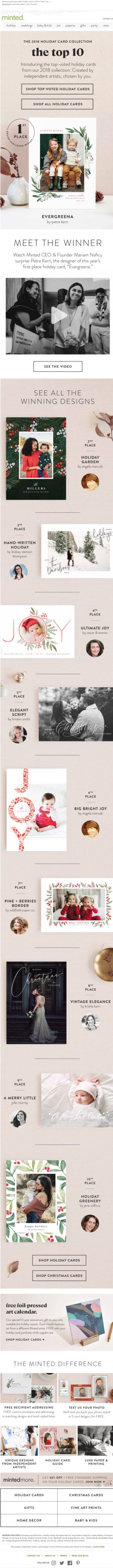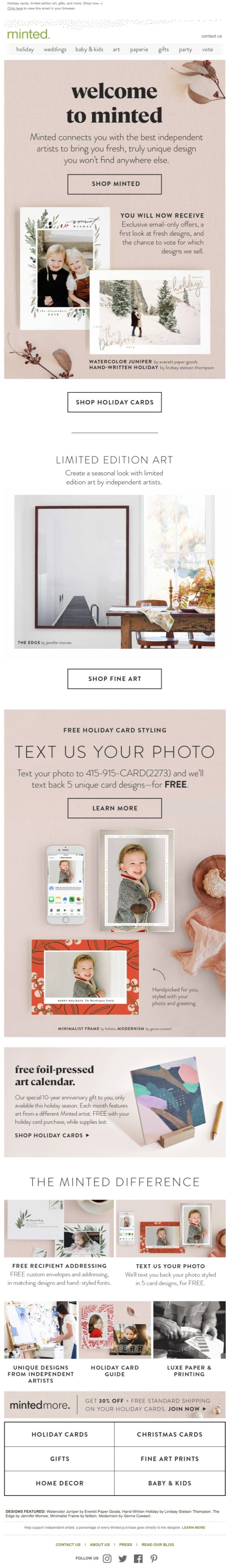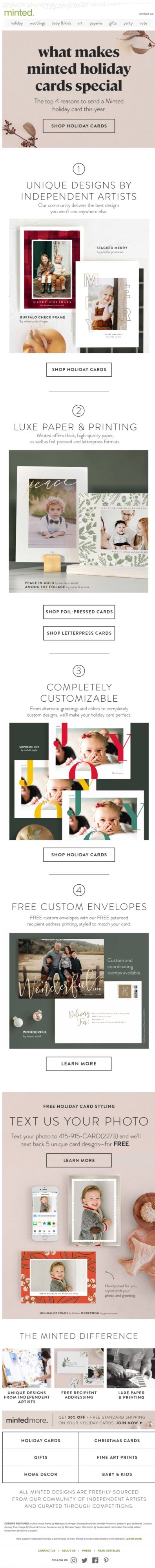 Cieszę się z organizacji tego e-maila — wiersz tematu dokładnie informuje, ile przyczyn dotyczy e-mail, i są one wyraźnie oznaczone w kopii wiadomości. Ten e-mail jest również wskazówką dotyczącą podróży klienta, ponieważ Minted rozumie, że pytanie, które większość jego klientów zadaje, nie brzmi „Czy powinienem wysyłać kartki świąteczne?”, ale „Czy powinienem zamówić kartki świąteczne w Minted?”.