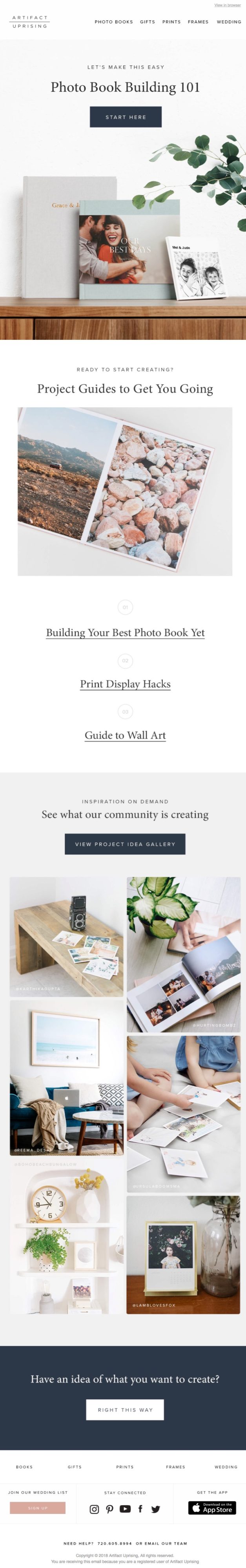 Kiedy planujesz swoją strategię e-mail marketingu, najlepiej najpierw zrozumieć procesy myślowe klientów i jak możesz im pomóc. Artifact Uprising wyraźnie wykonał świetną robotę, dostarczając subskrybentom odpowiedzi na pytanie „Od czego zacząć?” zanim nawet pomyślą, żeby zapytać.