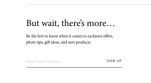 Warto od razu zauważyć, że Artifact Uprising ma jedne z najczystszych i najbardziej estetycznych projektów. Ich strona internetowa jest przejrzysta i minimalistyczna, dzięki czemu ich produkty naprawdę błyszczą. Chociaż znalezienie formularza rejestracji e-maila zajęło mi chwilę (znajduje się w lewym dolnym rogu), podobało mi się, że doświadczenie nie wymagało zbyt wielu informacji i nie było krzykliwym wyskakującym okienkiem Formularz. Chociaż myślę, że Artifact Uprising zyskałoby więcej subskrybentów, gdyby umieścili ten formularz w bardziej widocznym miejscu na stronie głównej, zawiera on pomocny opis tego, czego może oczekiwać nowy subskrybent po zarejestrowaniu się.