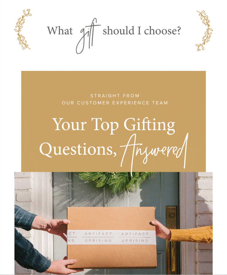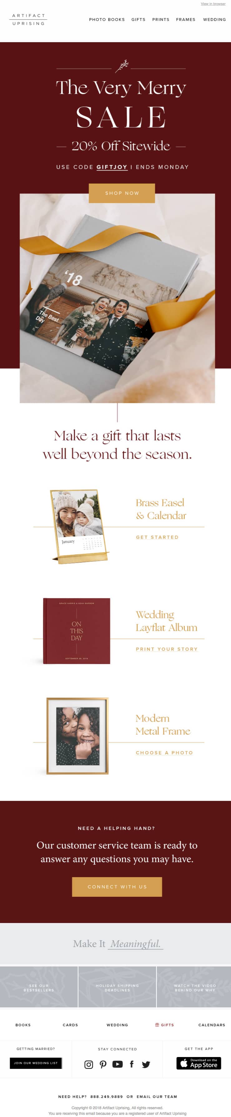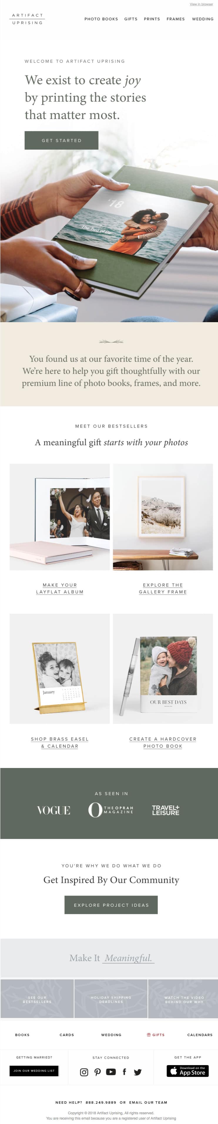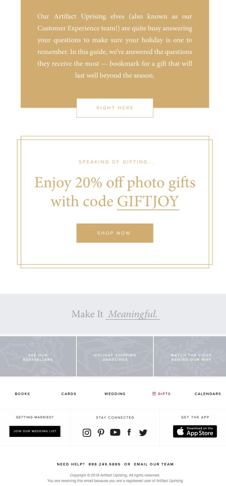 Mając to na uwadze, Artifact Uprising wykorzystuje gustowne podejście, które podkreśla ważne informacje dla czytelników, którzy po prostu przeglądają. Ich wezwanie do działania na górze e-maila to sprytna taktyka w sezonie, kiedy czytelnicy są przytłoczeni i szukają idealnego prezentu. Kiedy to dotarło do mojej skrzynki odbiorczej wraz z innymi e-mailami używającymi wielkich liter i wykrzykników, aby sugerować pośpiech, uproszczony projekt i pomocna kopia Artifact Uprising były mile widzianym powiewem świeżego powietrza.