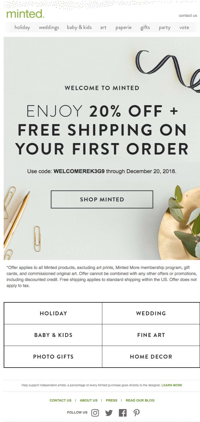 Jest to prawdopodobnie e-mail, który byłbym najbardziej podekscytowany otrzymaniem z dwóch powodów – jest skuteczny, pokazuje wszystko, co najlepsze w jednym miejscu, i jest interesujący, pokazuje bardziej ludzki pierwiastek i więź z lokalnymi artystami. To zabawne zastosowanie marketingu przyczynowego, pokazujące, że Minted wspiera lokalnych przedsiębiorców, co sprawia, że doceniam to, co reprezentuje ich firma i zwiększa moje zainteresowanie ich produktami.