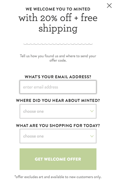 Wyskakujące reklamy czasami mają złą reputację, ale gdy zawierają dokładnie to, czego szukam, oprócz kodu rabatowego (z bezpłatną wysyłką), nie mam żadnych skarg. Ten przyjazny formularz pojawia się zaraz po wejściu na stronę główną Minted i jest zdecydowanie zachętą do zapoznania się z ich produktami i skorzystania z kodu rabatowego.