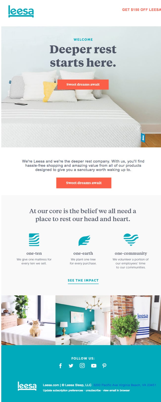 Ich powitalna wiadomość e-mail jest oparta w dużej mierze na jasnych kolorach i powoduje marketing — upewniają się, że informują Cię o pozytywnym wpływie ich firmy na większe dobro. Na początek jest to mocne podejście dla każdej firmy i jest to odświeżające podejście w porównaniu ze skrzynką odbiorczą zasypaną od razu informacjami o materacach.