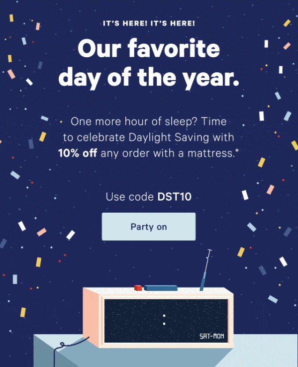 Jeśli jest jakaś firma, która może wykorzystać te „wakacje” na swoją korzyść, to są to firmy produkujące materace. I nic dziwnego, że jako jedyni w mojej skrzynce odbiorczej potwierdzali zmianę czasu, nie wspominając o oferowaniu kodu rabatowego z okazji świętowania! Wygrana.
