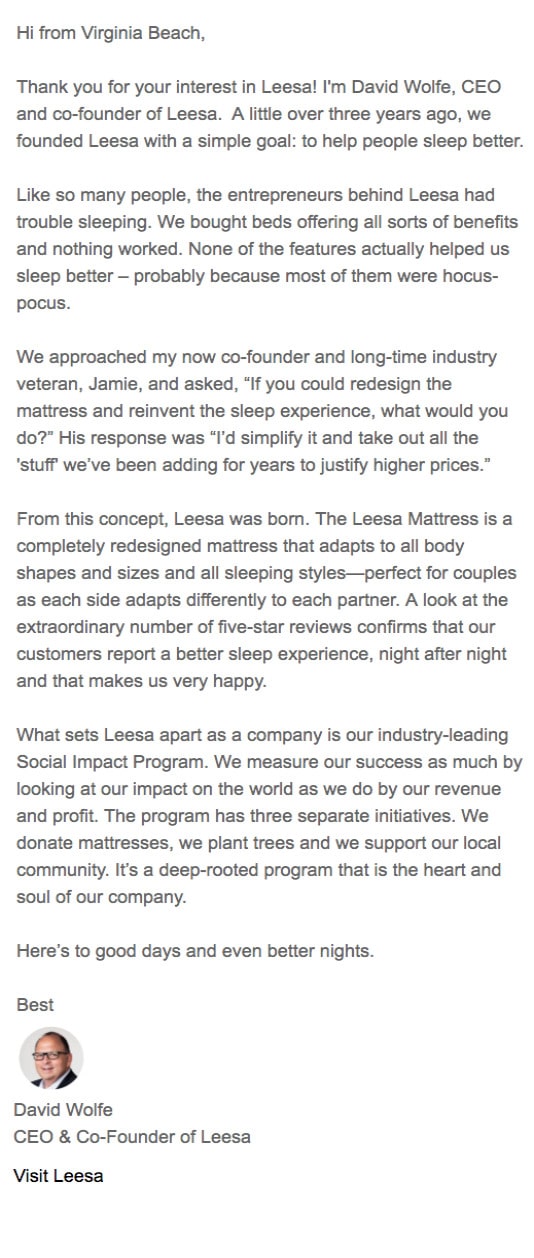 Dobra, pierwsza myśl tutaj jest naprawdę świetna. Klienci uwielbiają umieszczać twarze z imionami i widzieć ludzi stojących za ich ulubionymi produktami. Uwielbiam, że dyrektor generalny Leesy opowiada o tym, jak założył firmę, i jest to szczery i szczery e-mail.
