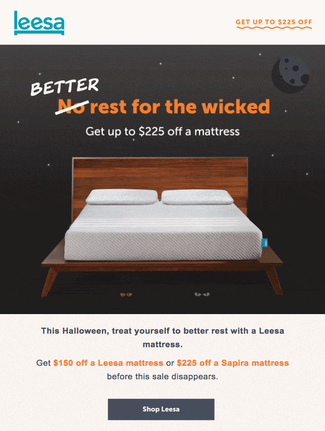 Casper i Leesa niesamowicie dobrze prezentują tę koncepcję, ponieważ oboje czekali do najbardziej sennych godzin dnia, aby wysłać swoje e-maile – po godzinie 16:00. Nie wiem jak wy, ale na pewno wtedy najprawdopodobniej zacznę marzyć o nowym materacu. Ta prosta, ale genialna taktyka jest doskonałym przykładem naginania „zasad” w celu dopasowania do Twojej marki.