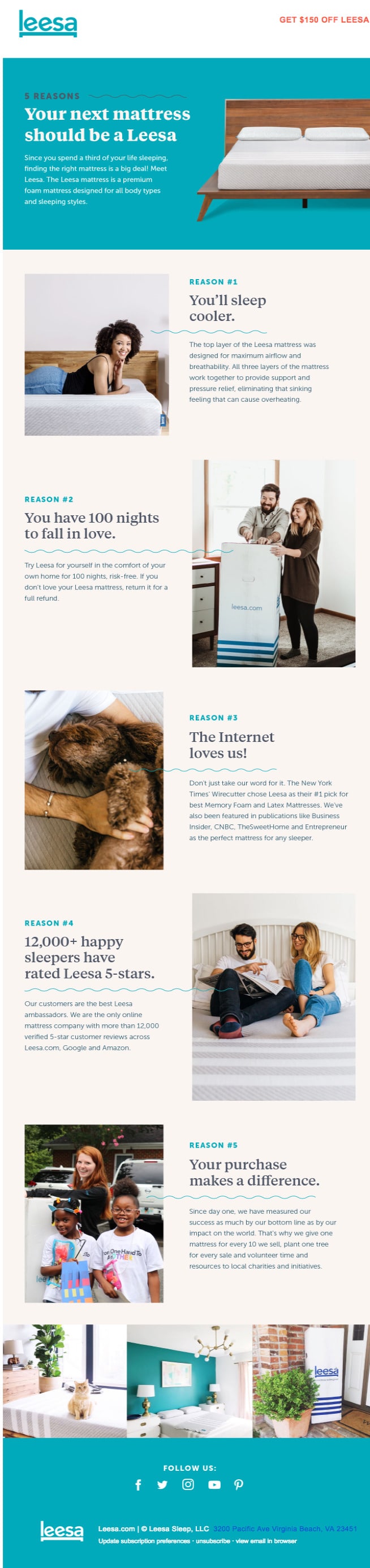 E-mail edukacyjny firmy Leesa świetnie sprawdza się, pomagając odbiorcom wyobrazić sobie, jak ich materace będą pasować i poprawić ich życie. Podoba mi się, jak ten e-mail obejmuje różne tematy i punkty, które mogą być atrakcyjne dla różnych klientów, ale nie są przytłaczające. Jest to w dużej mierze możliwe dzięki bardzo czytelnemu nagłówkowi wyjaśniającemu cel wiadomości e-mail, jednak można go lepiej obsługiwać z wyraźnym przyciskiem CTA na końcu. Chcesz mieć pewność, że Twoi potencjalni klienci zawsze wiedzą, jakie działania mają podjąć w następnej kolejności!