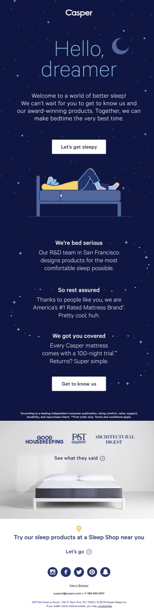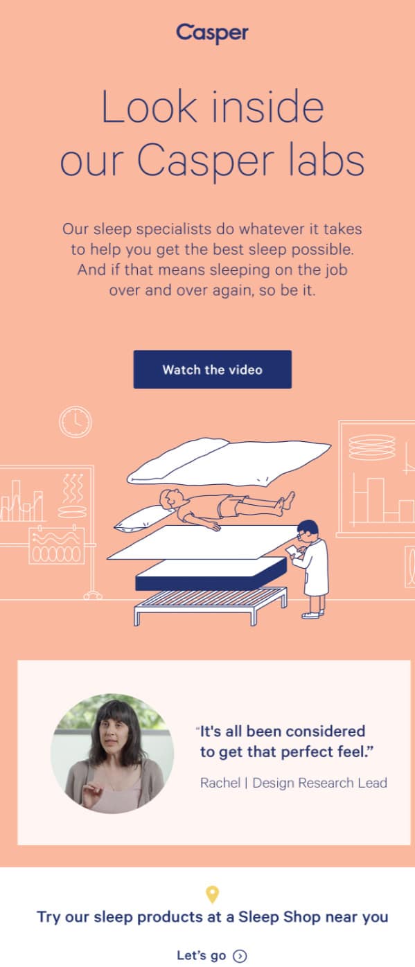 Może być trudno znaleźć równowagę między beztroską a informacją w e-mailu edukacyjnym dotyczącym produktu, ale Casper wykonuje świetną robotę, utrzymując przystępny ton marki, jednocześnie oferując informacje.