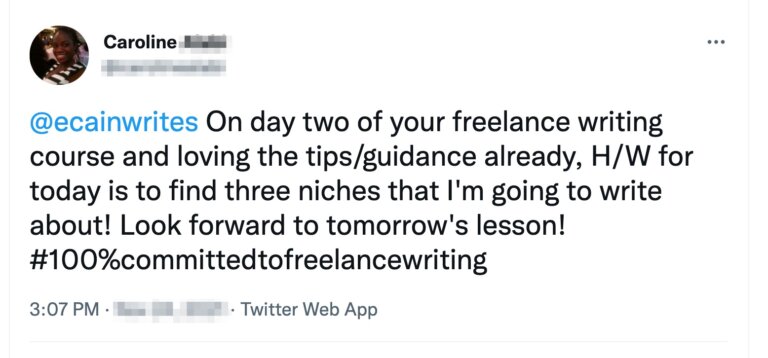 To, co robię już od jakiegoś czasu (powiedziałbym, że od dwóch lat) polega na tym, że ludzie oznaczą mnie na Twitterze, kiedy zapiszą się na mój bezpłatny kurs, Get Paid to Write.