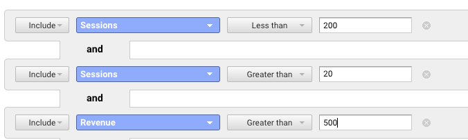 - W tym przykładzie filtrowałem według zapytań między 20-200 sesjami o przychodach przekraczających 500 USD