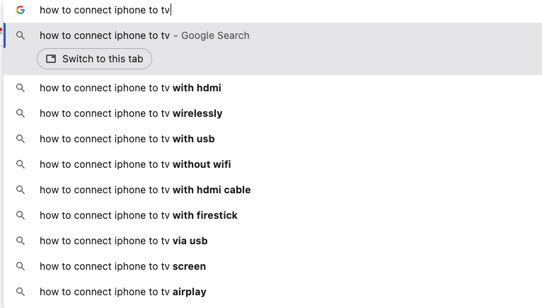 Wracając do przykładu z iPhonem, kiedy wpisuję „jak podłączyć iphone'a do telewizora”, zaczynasz widzieć, że Google podpowiada kilka dość konkretnych zapytań. Mógłbym zacząć przeglądać te pomysły na tematy i sprawdzić, czy któreś pasowałyby do naszej strategii treści.