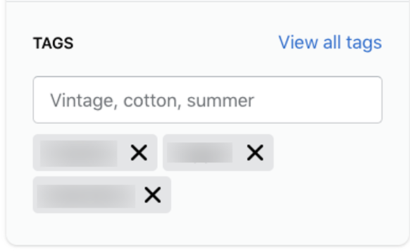 Ostatnią rzeczą, na którą należy zwrócić uwagę w przypadku zduplikowanych treści Shopify, są strony generowane przez tagi produktów. W ramach każdego produktu na prawym pasku bocznym znajduje się moduł, który umożliwia dodawanie tagów do poszczególnych produktów: