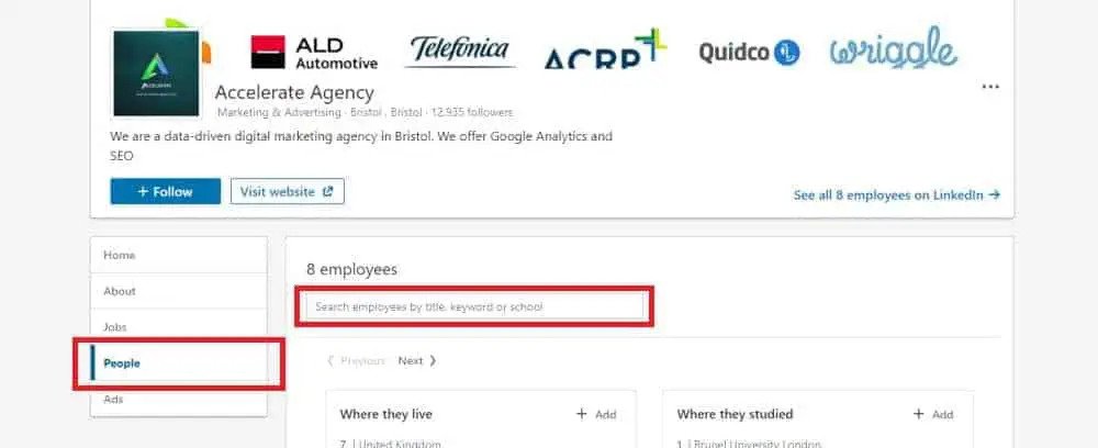 Pierwszym krokiem jest przejście do LinkedIn i wyszukanie nazwy odpowiedniej firmy lub witryny. Po znalezieniu firmy przejdź do sekcji „Ludzie” w jej profilu. Następnie możesz wyszukiwać ich pracowników według nazwy stanowiska lub innego słowa kluczowego.