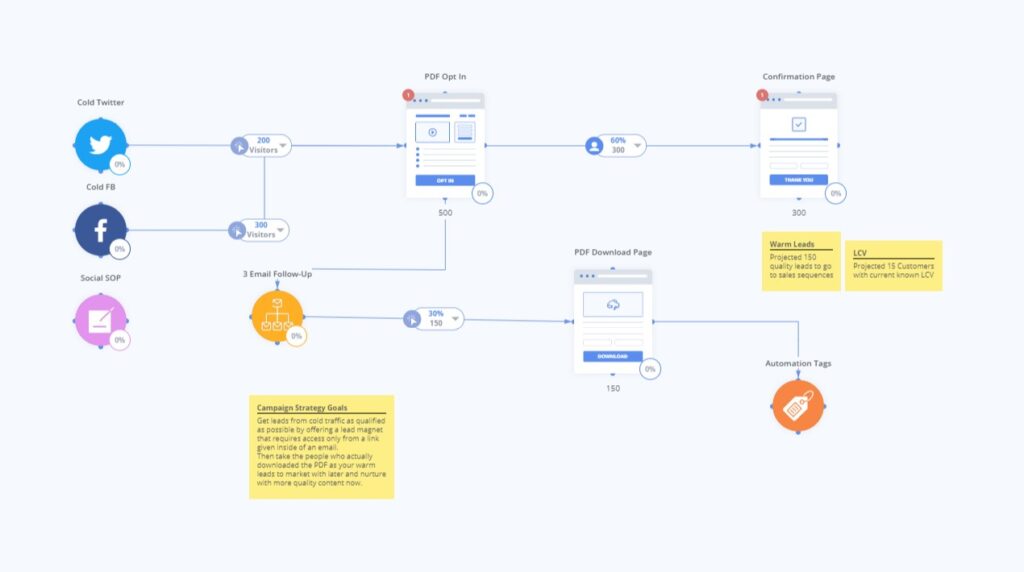 Jest to model, który zawiera wszystko na temat procesu marketingowego, od źródeł ruchu, etapów lejków, punktów interakcji z klientami, stron docelowych, a nawet metod remarketingowych.