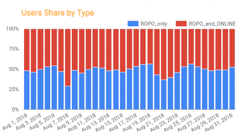 Budując poniższe wykresy, można było wizualnie pokazać udział użytkowników ROPO, którzy dokonali zakupów zarówno online, jak i offline oraz śledzić dynamikę zmian w tej kategorii użytkowników.
