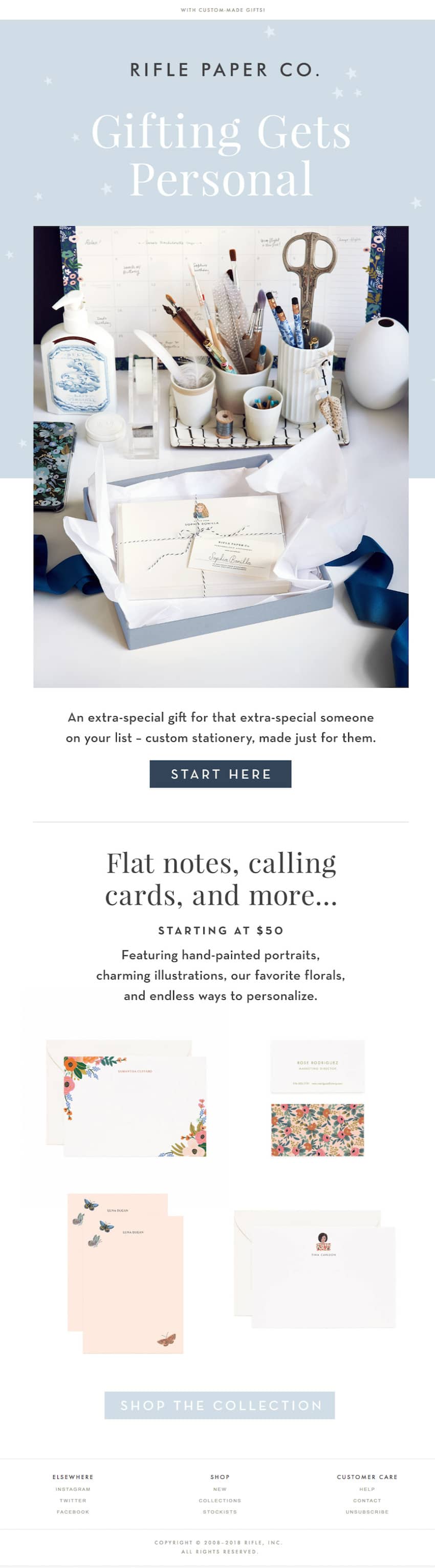 Rifle Paper Co .: „Obecnie jest połowa listopada, a święta są tuż za rogiem. Łatwo mogę się ekscytować lub stresować tym i długą listą świątecznych rzeczy, które muszę zrobić przed 25 grudnia, a marketerzy e-mailowi wiedzą. Podczas gdy niektóre e-maile krzyczą, aby zwrócić moją uwagę lub przedstawić niepotrzebnie pilną potrzebę (jeszcze nie jest jeszcze Święto Dziękczynienia!), ale Rifle Paper Co. przedstawiła łatwe rozwiązanie – bądź rozważny. Ich e-mail pokazuje, że wciąż mam czas, zanim nie będę spać całą noc, pakując prezenty, ale muszę działać już teraz, jeśli chcę wysłać coś wyjątkowego i dostosowanego do moich bliskich”.