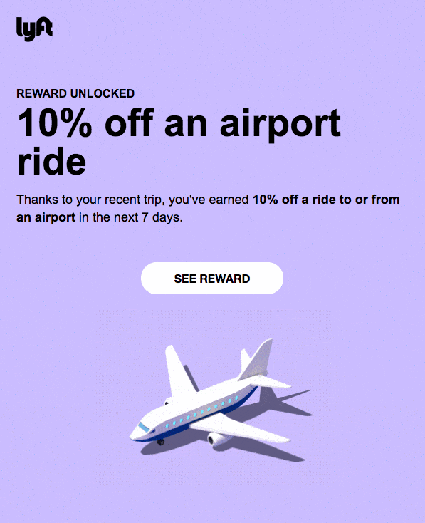 „Przejazd na lotnisko! Korzystałem już z różnych usług wspólnych przejazdów, ale Lyft pomaga mi w tej rundzie, wysyłając mi kupon z 10% zniżką. Złapałem przejażdżkę z lotniska Lyft, ale po mojej podróży ich system poczty e-mail był na tyle intuicyjny, że wiedziałem, że mogę potrzebować kolejnej jazdy w przyszłym tygodniu. Mieli rację! Czy zechciałbyś spojrzeć na ten gif?”