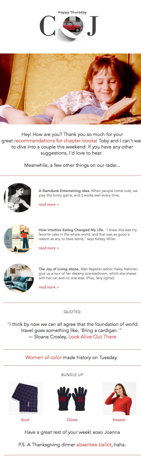 Cup of Jo: „Są dwa biuletyny, na które mam oko co tydzień, a pierwszy pochodzi z mojego ulubionego bloga wszechczasów, Cup of Jo. Joanna Goddard i jej zespół pisarzy są geniuszami treści, ale wykonują też świetną robotę, pamiętając o zainteresowaniach swoich czytelników i dzieląc sprytne frazy i kolorowe obrazy na małe kawałki inspiracji. Chociaż zwykle odradzałbym tematy takie jak „Hej, co słychać?”. i „Szczęśliwego (prawie) weekendu” działa tutaj, ponieważ zespół Cup of Jo dołożył należytej staranności w budowaniu wiarygodności.