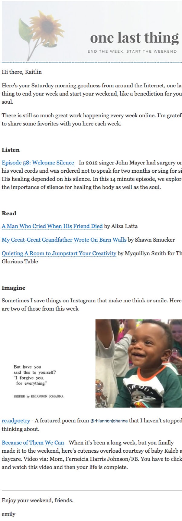 Emily P. Freeman: „Drugim biuletynem, na który czekam co tydzień, jest pisarka i blogerka Emily P. Freeman „One Last Thing”. Jako pisarka znam toczącą się walkę o zbyt wiele słów i niewystarczającą ilość białej przestrzeni lub obrazów, aby się z nimi połączyć, ale Emily dopracowała ten stosunek do perfekcji. Moją ulubioną częścią jej biuletynów jest to, że prawie zawsze jest coś, co przemawia do wielu zmysłów – podcasty do słuchania, zdjęcia z Instagrama do podziwiania i liryczna proza do noszenia przy sobie – i pomaga mi złapać oddech przed rozpoczęciem weekendu.