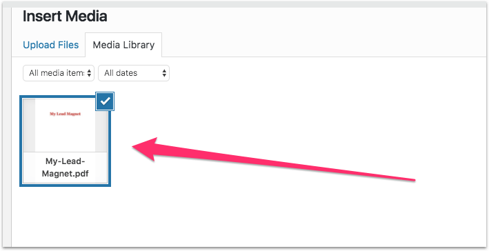 Następnie znajdź i wybierz plik PDF (główny magnes) w Bibliotece multimediów WordPress: