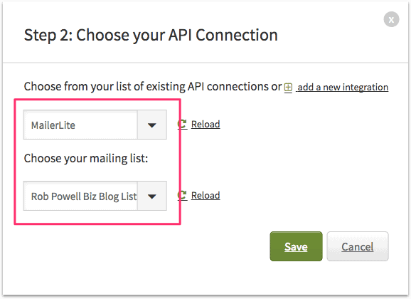 Następnie wybierz platformę e-mail marketingu (dostawcę usług e-mail) i nazwę swojej listy:
