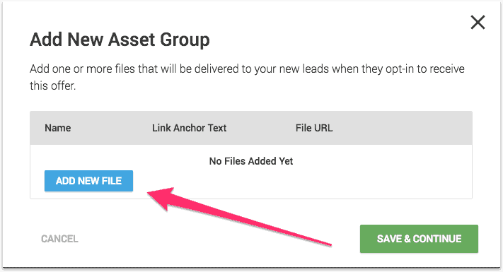 W tym momencie możesz, jeśli chcesz, dodać kolejny plik do grupy aktywów. Zrobiłbyś to jednak tylko wtedy, gdy Twój lead magnet składa się z dwóch lub więcej oddzielnych plików.