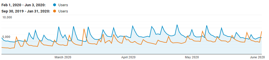 Po wprowadzeniu szeregu ulepszeń na swojej stronie internetowej i zoptymalizowaniu jej za pomocą nowych treści, Sarco Inc. zaczął odnotowywać stały wzrost ruchu na stronie. Możesz zobaczyć wzrost, którego doświadczyli w tej pierwszej części ich kampanii, za pomocą poniższego obrazu, który pokazuje ruch organiczny na ich stronie od 1 lutego 2020 r. do 3 czerwca 2020 r., nałożony na okres od 30 września 2019 r. do 31 stycznia 2020 r.