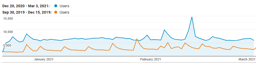 Nie minęło dużo czasu, zanim wyniki zaczęły się prezentować, a najlepiej można je pokazać, porównując kilka pierwszych miesięcy postępów Sarco Inc. z okresem sprzed roku. Poniżej możesz zobaczyć zmianę w ruchu organicznym na sarcoinc.com w okresie od grudnia 2020 do marca 2021 w okresie od września 2019 do grudnia 2019. Są to mniej więcej analogiczne okresy czasu i pokazują zmianę rok do roku do ruchu organicznego Sarco.