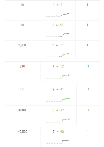 Możesz także zobaczyć niektóre z dramatycznych zmian w ruchu słów kluczowych, których doświadczyła firma Sarco Inc. w wyniku wstrząsu w ich kampanii. Poniższy obrazek pokazuje znaczący ruch, jakiego doświadczył Sarco Inc. w przypadku niektórych konkurencyjnych słów kluczowych, na które celowaliśmy w ich projekcie.