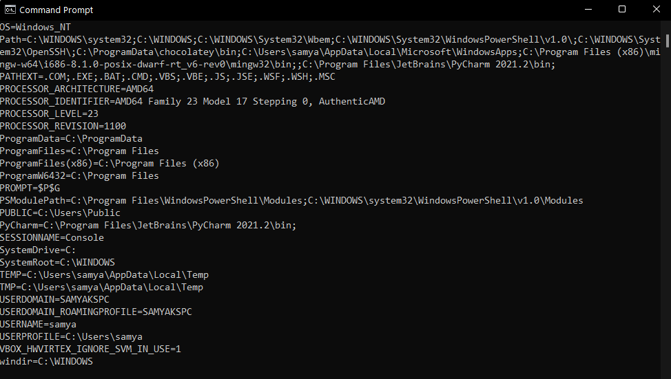 Teraz wpisz „set” i naciśnij Enter. Możesz zobaczyć całą listę zmiennych środowiskowych bez żadnej kategoryzacji, w przeciwieństwie do metody opartej na GUI.