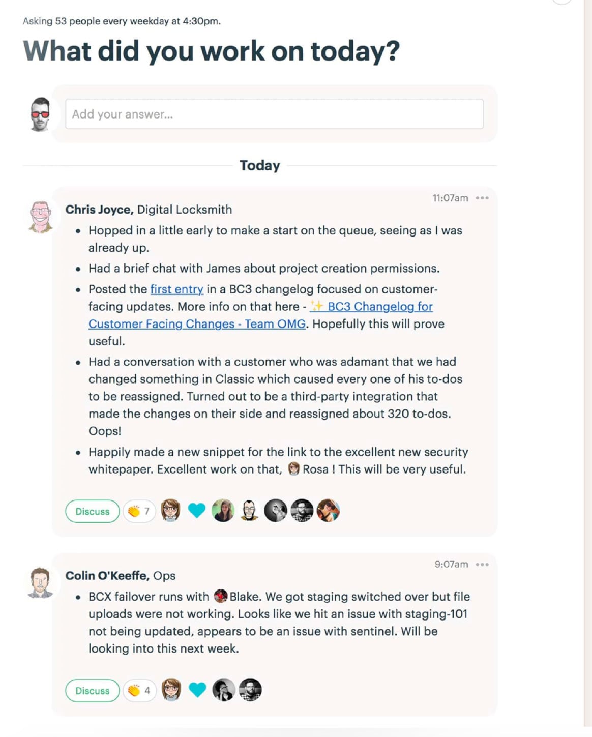 Ponadto dzięki funkcjom takim jak odprawa, które pozwalają zadawać członkom zespołu podstawowe pytania o określonej godzinie każdego tygodnia, możesz skrócić czas spotkań.