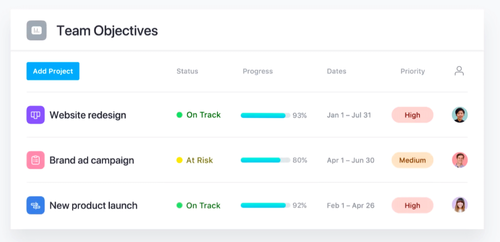 Powyższy przykład pokazuje stan kilku projektów na pierwszy rzut oka, pokazując, które są zgodne z celem, jak blisko ukończenia jest każdy z nich i przypisując każdemu poziom priorytetu.