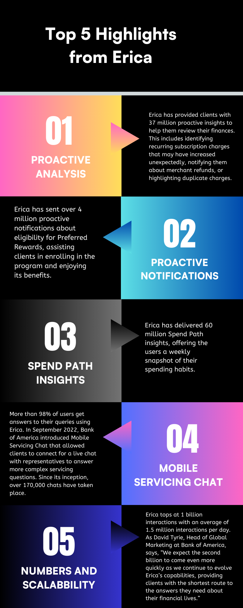 Erica é assistente financeira virtual orientada por IA do Bank of America. A ferramenta AI chatbot foi projetada para ajudar os clientes a gerenciar suas vidas financeiras. Ao fornecer insights proativos, responder a perguntas complexas e conectar clientes a especialistas financeiros, Erica estabelece um novo padrão para atendimento ao cliente baseado em IA no mundo financeiro.