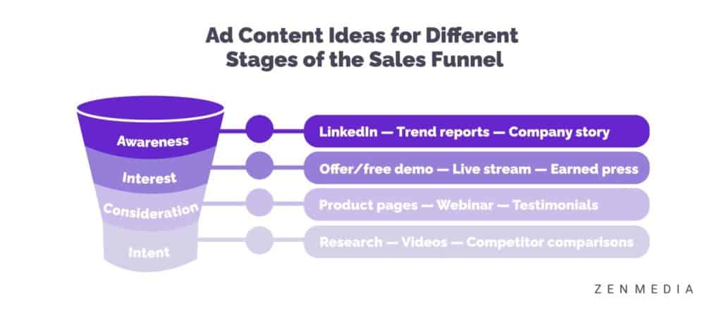 Assim como você faz com o conteúdo, você deve criar anúncios para diferentes estágios do funil de vendas/jornada de compra do cliente.